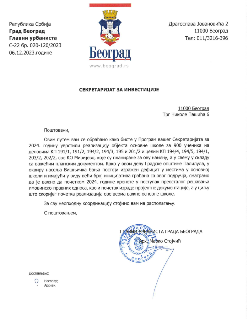 Na tim sastancima potvrđeno je da postoji planirana lokacija za novu školu i da su parcele za tu namenu definisane u urbanističkim dokumentima.